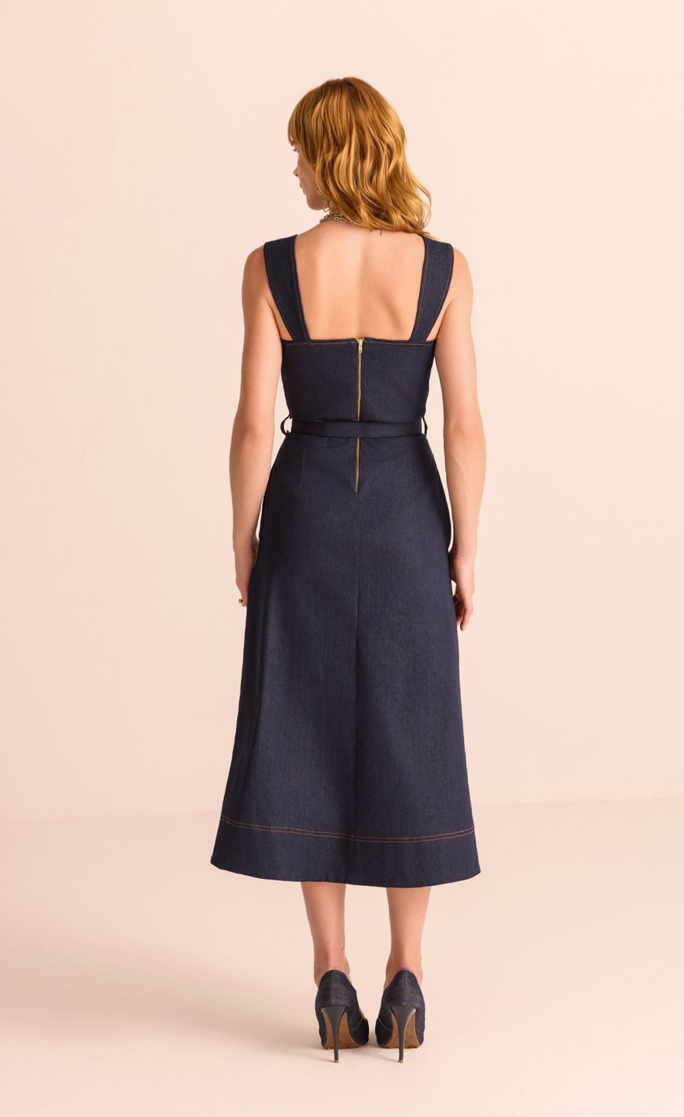 Vestido jeans midi com decote princesade alça evasê jeans com recortes marcados em pesponto contrastante