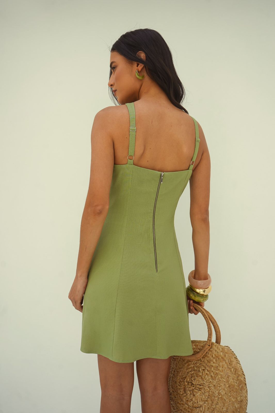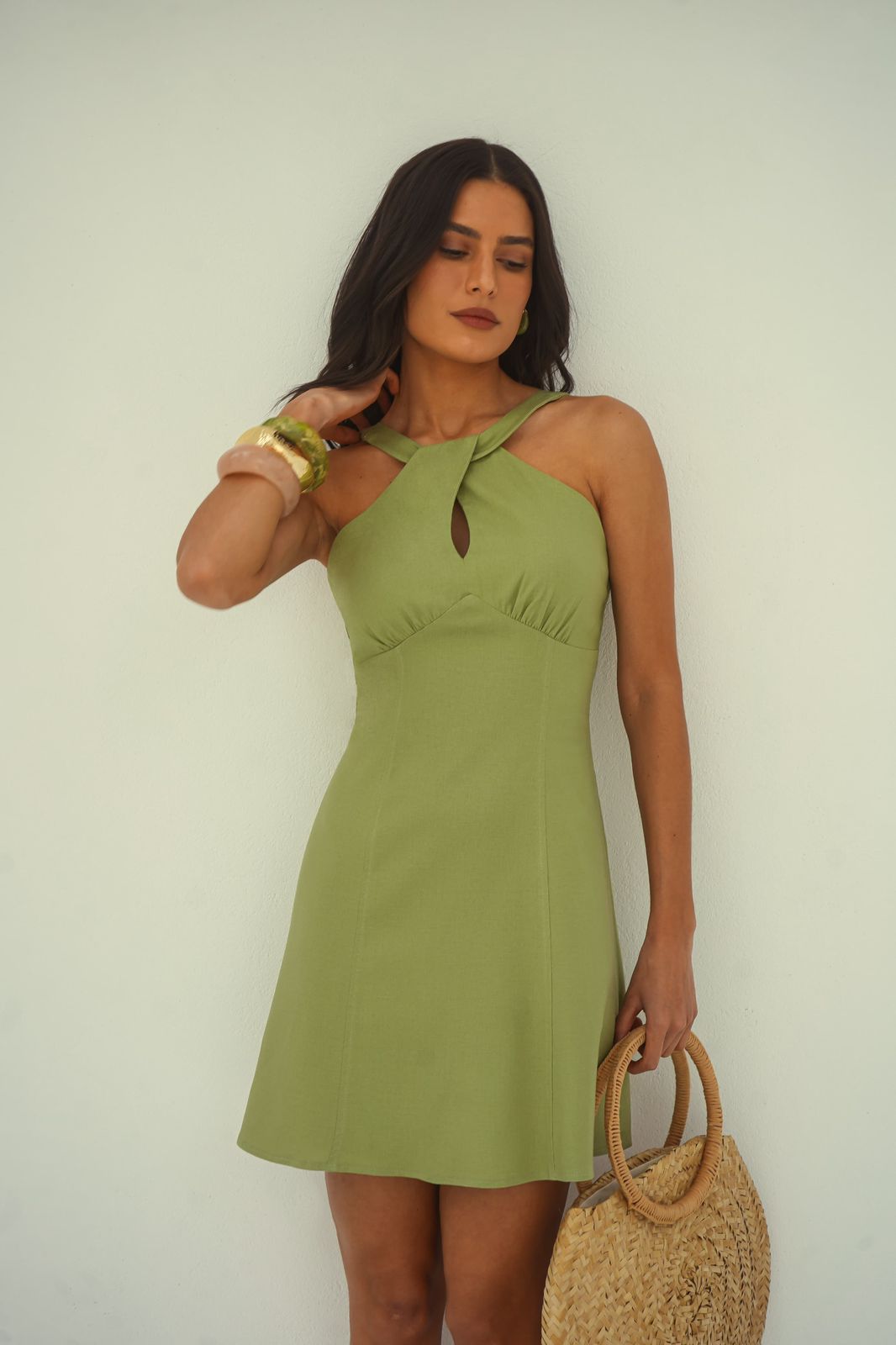 Vestido curto em linho. Possui torção no decote com franzido localizado no busto, alças reguláveis, fechamento em zíper de metal nas costas e forro.