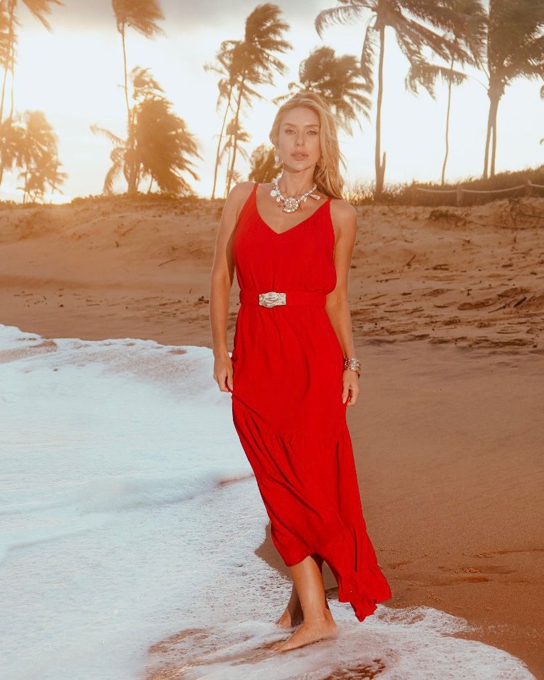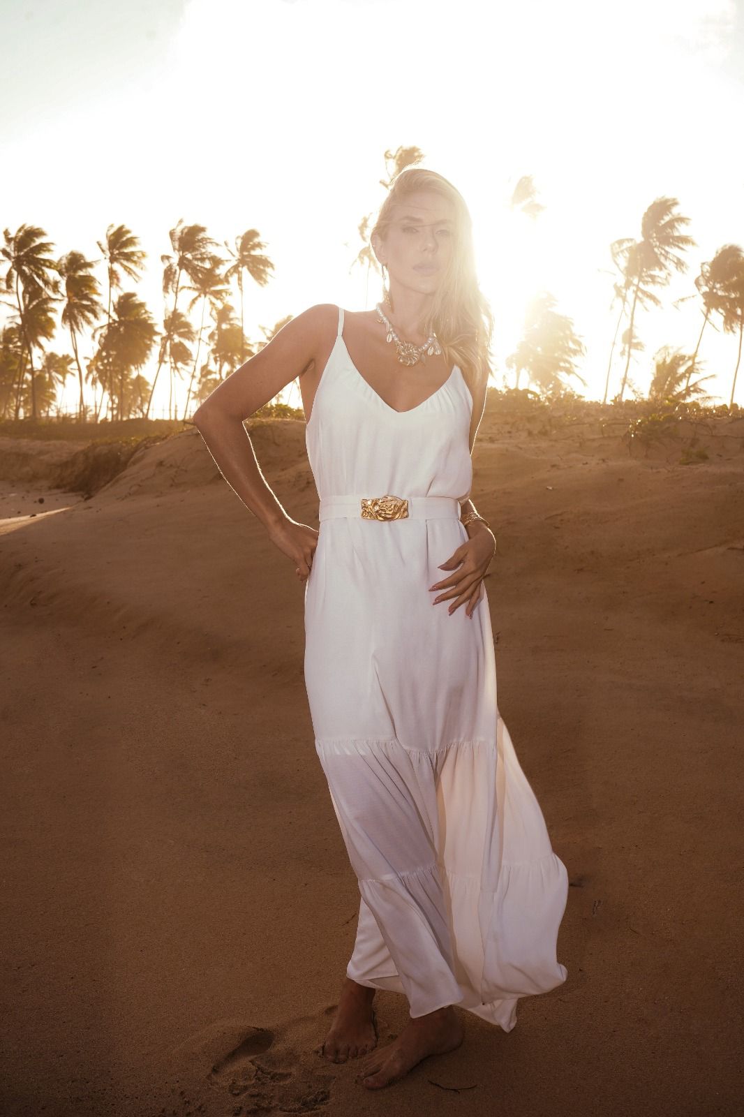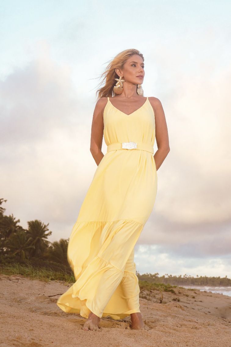 Vestido longo em alfaiataria leve texturizada. Possui franzido no decote, alças reguláveis, elástico nas costas e forro. Acompanha cinto do mesmo tecido com elástico e aviamento de metal.