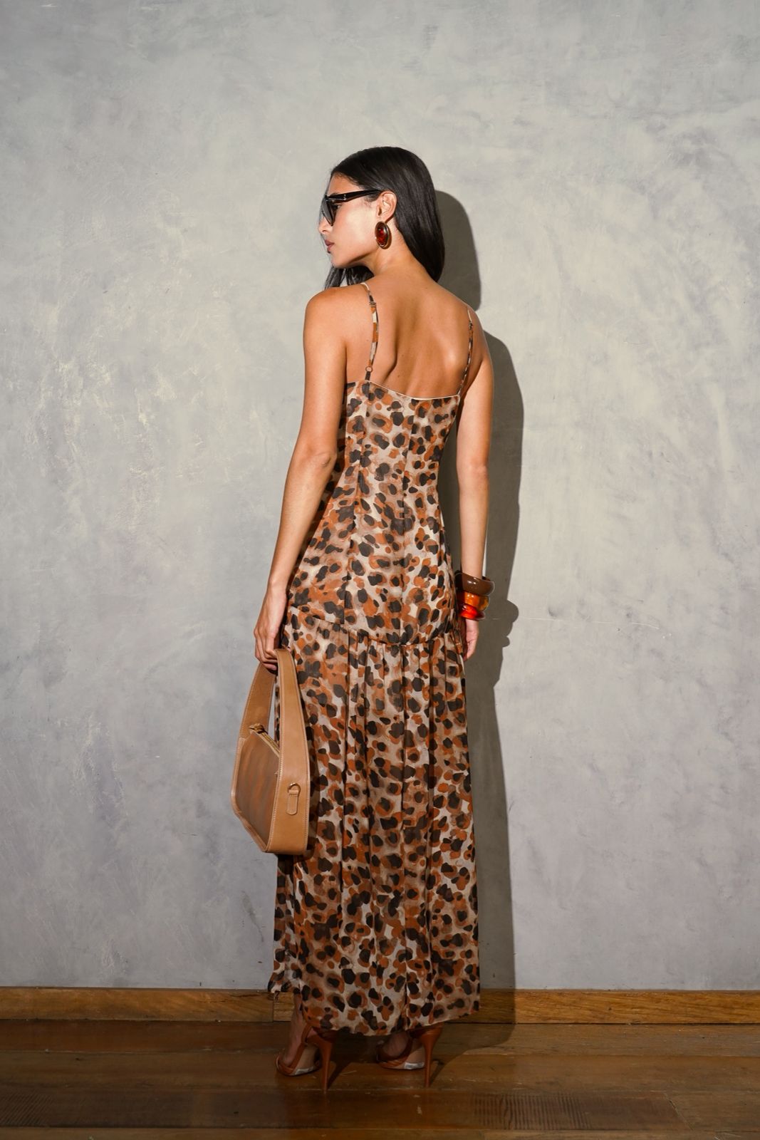 Vestido longo em chiffon estampado. Possui coulisse fixo, alças reguláveis, franzido localizado no busto, zíper de nylon lateral, fenda na barra e forro.