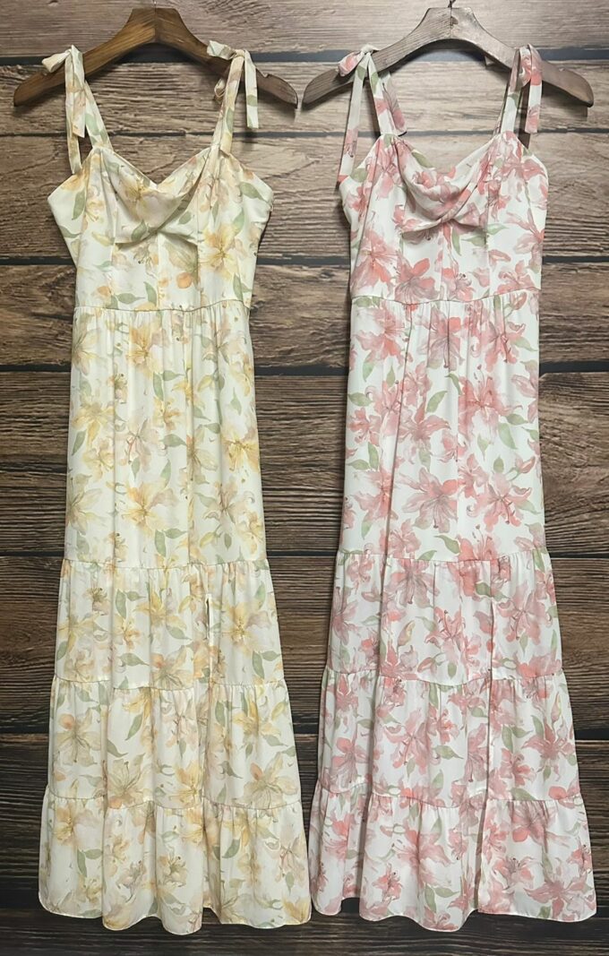 Vestido longo em crepe floral exclusivo. Possui alça para amarração, torção no decote, zíper de nylon lateral, fenda na barra, lastex nas costas e forro.