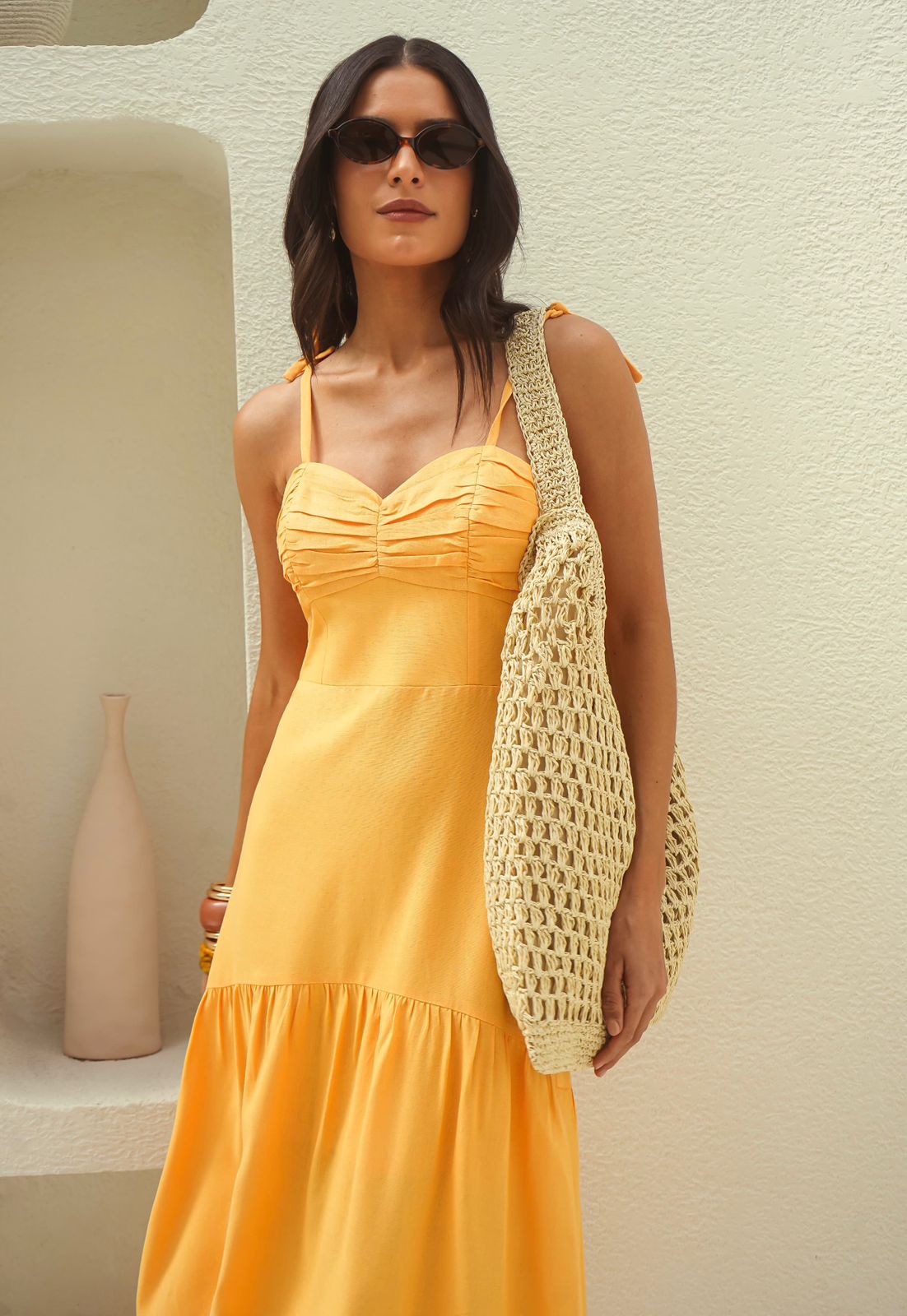 Vestido midi em linho. Possui busto franzido, alças para amarração, fechamento em zíper de metal nas costas e forro.