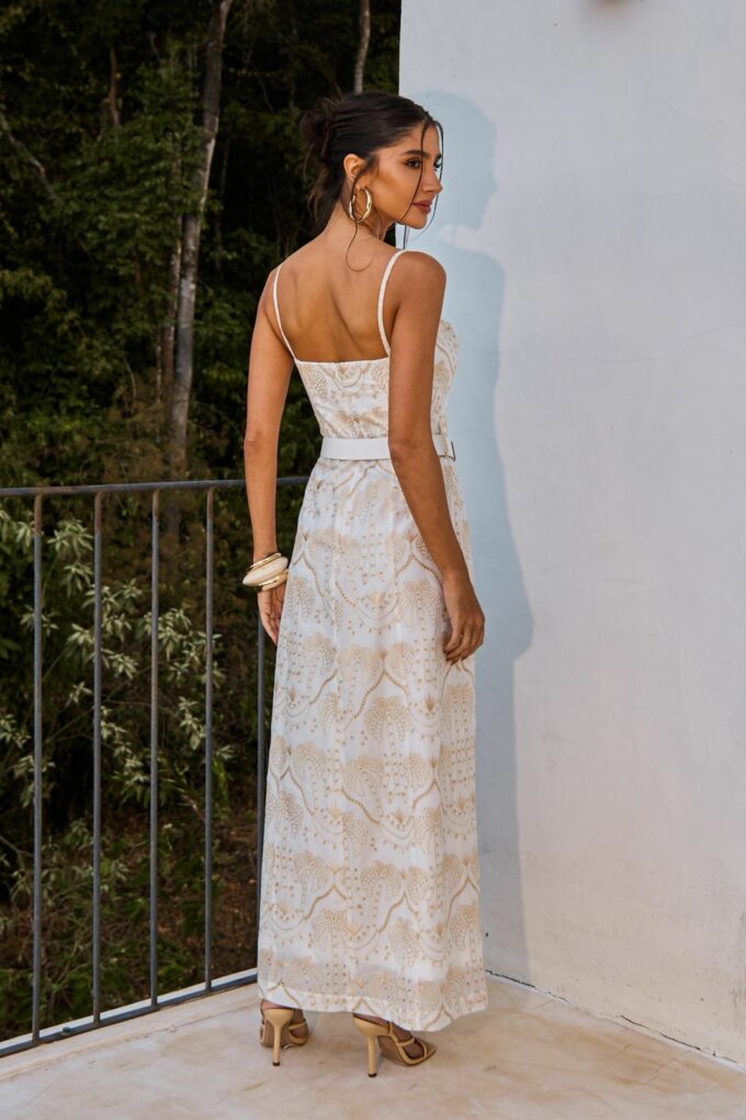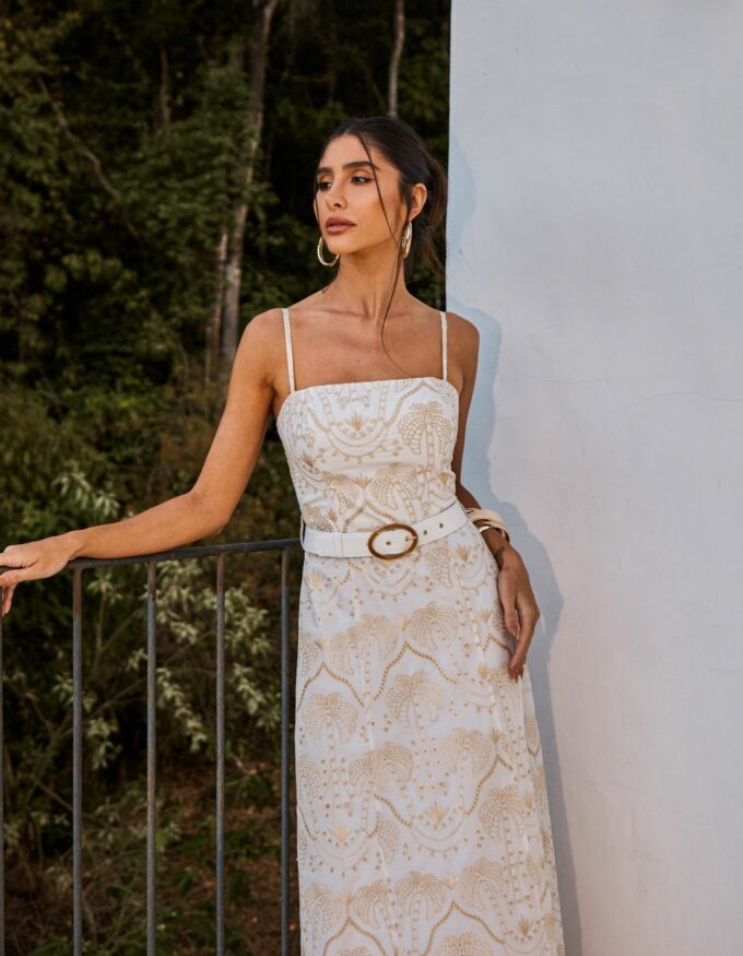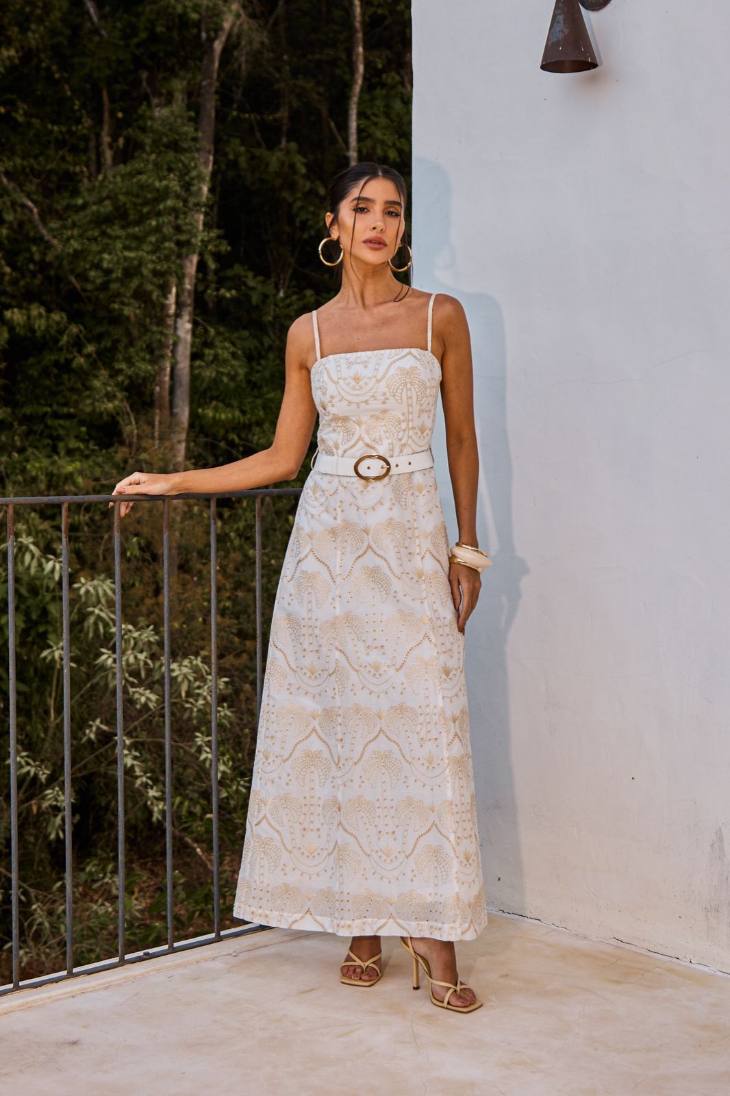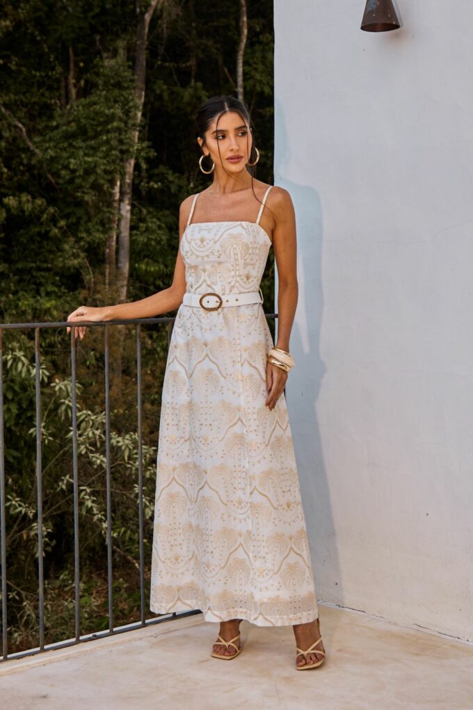 Tecido tricoline com bordado Modelagem ajustada no busto com saia evasê Alças finas e decote reto para um visual delicado Cinto removível com fivela forrada