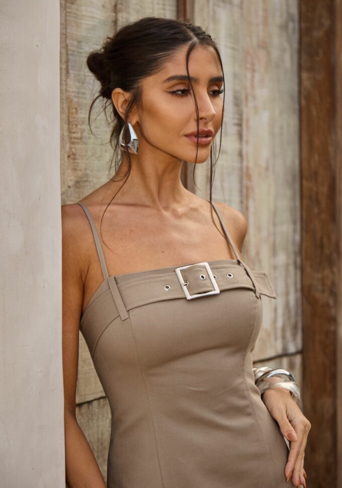 Sarja estruturada Decote reto com aplicação de cinto com fivela Alças finas delicadas Modelagem ajustada com zíper traseiro